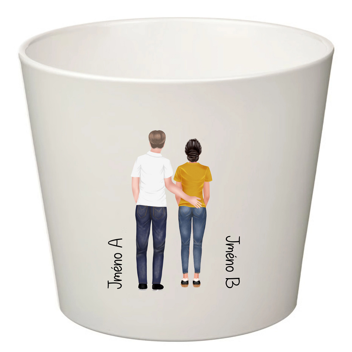 Vytvořte si originální květináč, který bude přesně odpovídat Vám nebo Vašim blízkým. Tento bílý keramický květináč si můžete plně personalizovat podle vlastních představ — upravit vzhled postaviček, zvolit účes, barvu vlasů, oblečení, boty i další detaily a doplnit je o jména.